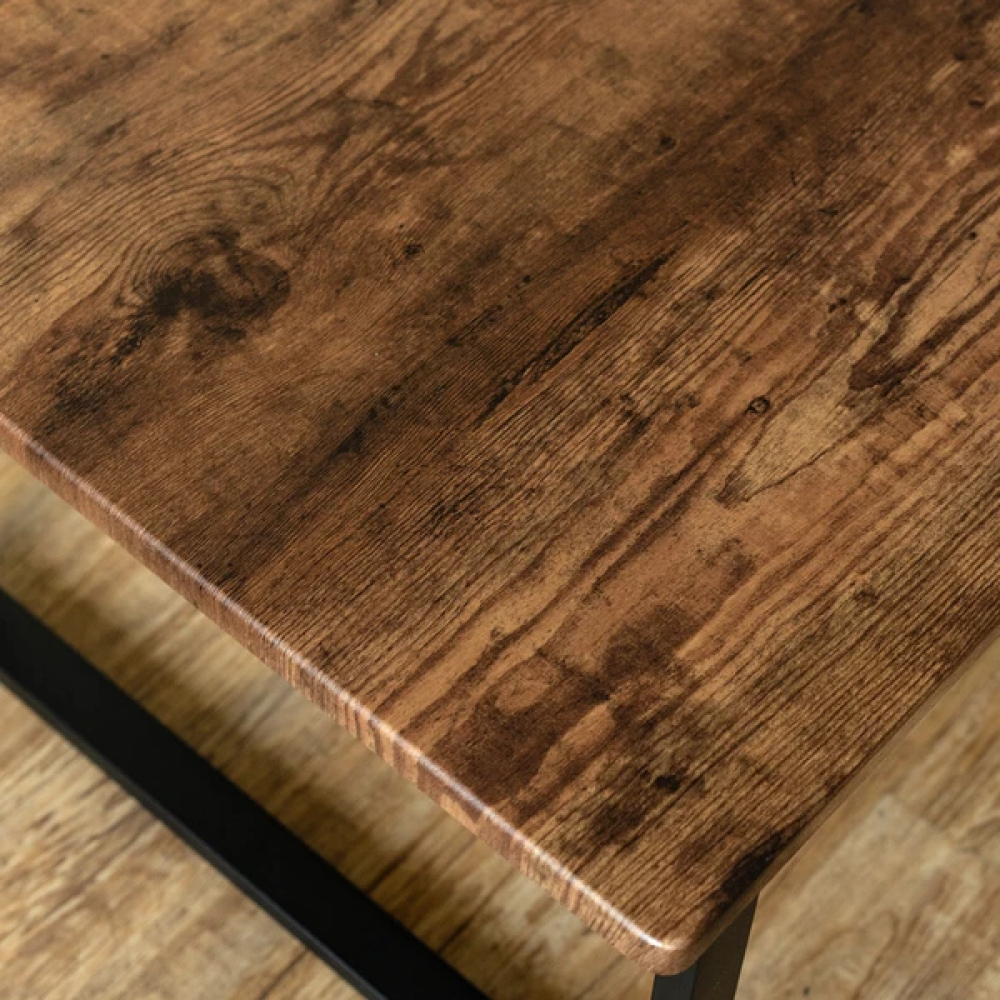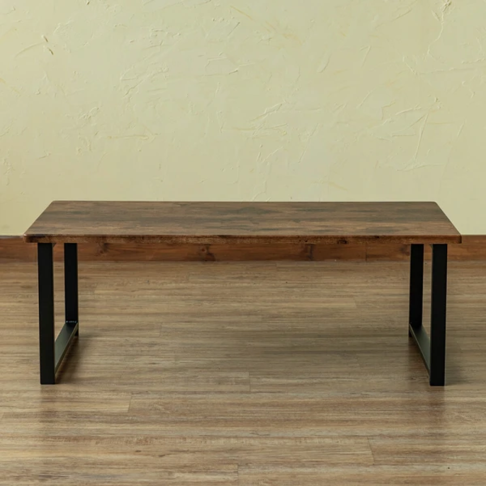 ◆スチールフレームと木目調天板がおしゃれなセンターテーブル◆ 飽きのこないベーシックデザインのセンターテーブル。 天板下には厚み約15mmのフレームが通っているので 反りにくく丈夫な造りになっています。 角がしっかり立ったモダンなデザインです。 天板は汚れや水に強いPVCシートを使用。 普段使いに気兼ねなく使えるテーブルです。