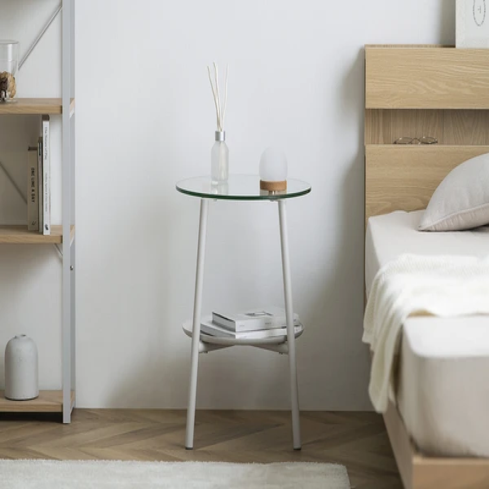 ガラス天板でお部屋に開放感をもたらし、お部屋を広く魅せるリビングテーブル・サイドテーブルです。棚板と脚部はグレーでアクセントをプラスしています。天板は厚さ約8mmの強化ガラスと飛散防止フィルムで、割れた際にもガラスが飛び散りにくい安心設計です。